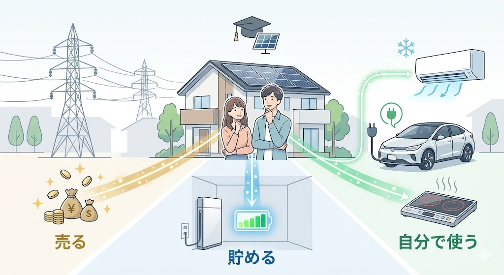 卒FIT後の選択肢は大きく分けて3つです。売電を続ける、蓄電池を導入する、自家消費を増やす。この3つを家庭の生活スタイルに合わせて比較することが必要です。どれが正解かは、昼間在宅か、夜の使用量が多いか、停電対策を重視するかで変わります。