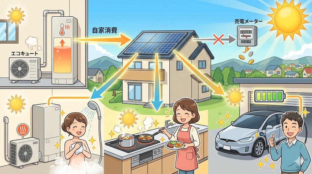 蓄電池がなくても、エコキュートの昼間沸き上げやEV充電などで自家消費率を高めることは可能です。特にオール電化住宅では、給湯や調理を電気中心でまかなうため、太陽光の電気を無駄なく使いやすくなります。売るより使う発想が、卒FIT後はますます重要になります。