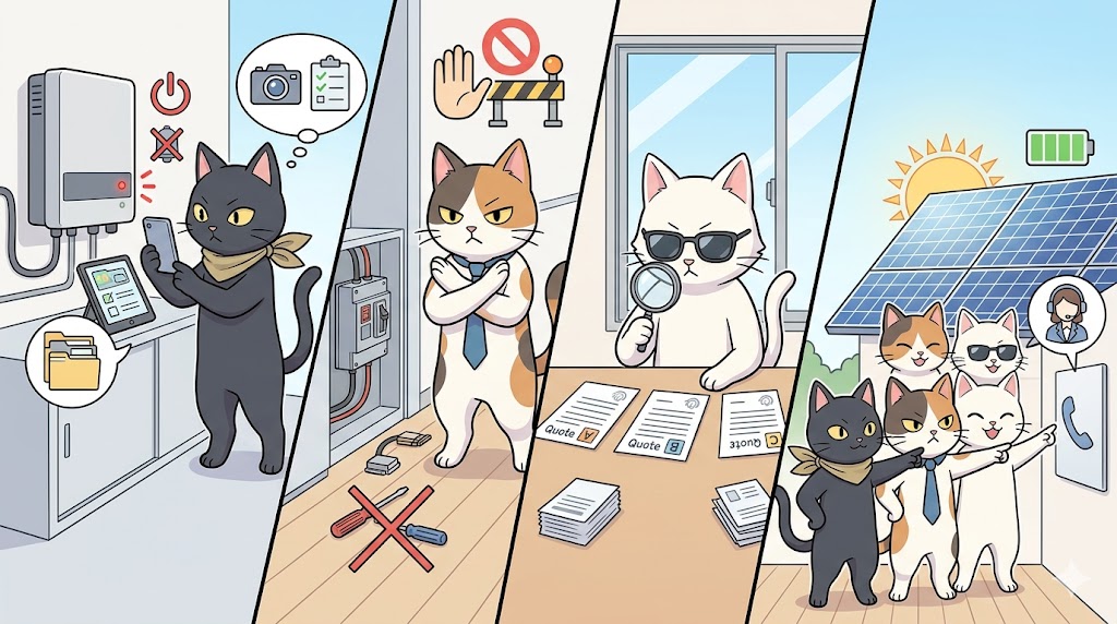 ここがちゃんと揃っていると、見積もりや初回相談のスピードがかなり上がります。逆に「たぶんパワコンが悪いと思う」だけだと、どうしても一般論の返答になりやすいです。比較しやすい見積もりを取りたいなら、先に設備情報を揃えておく方が得です。