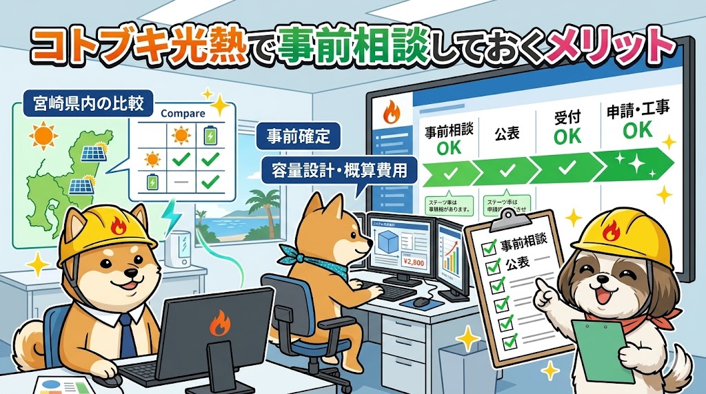 宮崎は日射条件の面でも太陽光と相性が良く、電気代対策や停電対策への関心も高い地域です。受付開始後に一気に比較しようとすると、見積、容量、対象条件の確認が重なって判断が雑になりやすいです。そうならないためにも、今の段階で情報整理を進めておく意味はかなり大きいです。