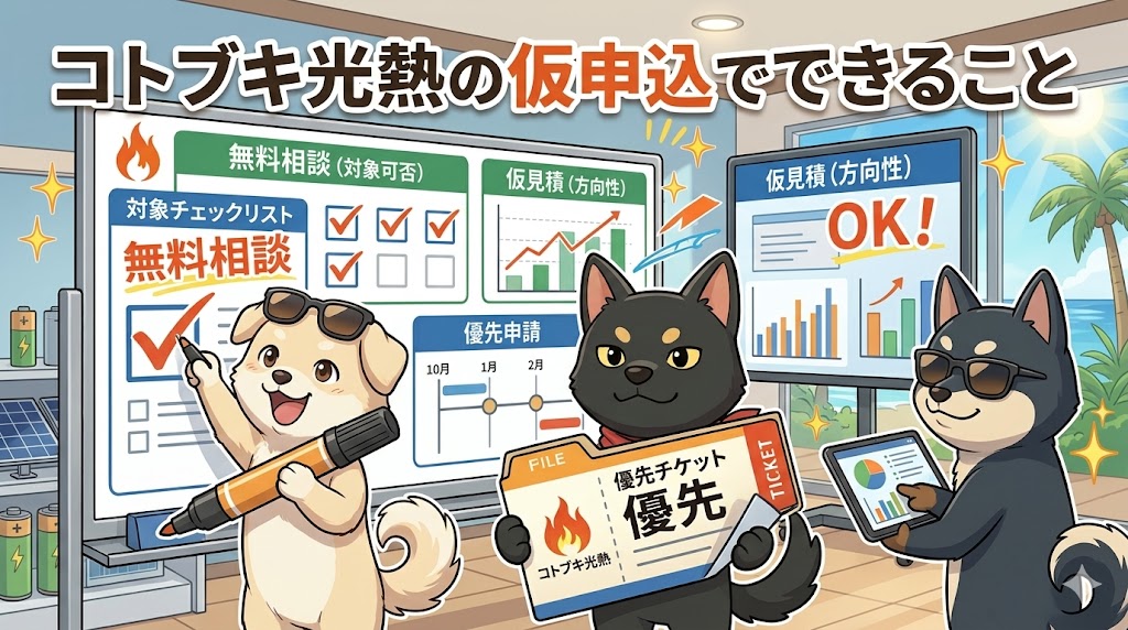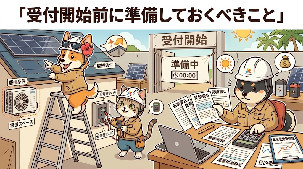 導入目的、電気使用量、屋根条件、概算予算を整理して、仮見積の方向性を固めておくことです。焦って契約するのではなく、正式公表後にすぐ比較・判断できる状態をつくることが、いちばん効率的です。