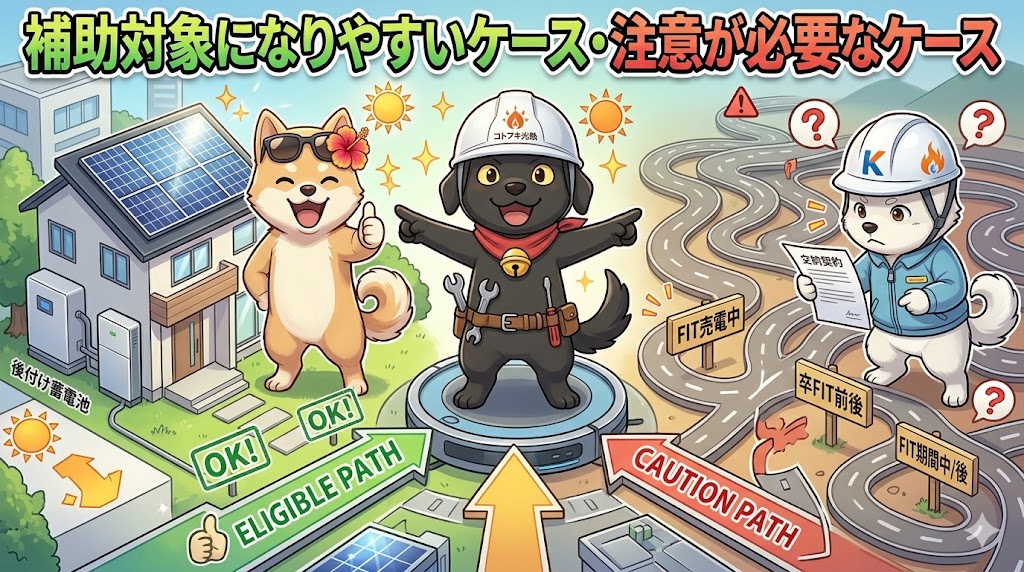 単純に「蓄電池だけなら何でも対象」という考え方ではありません。既設太陽光との接続や導入区分によって見方が変わるため、個別確認が必要です。